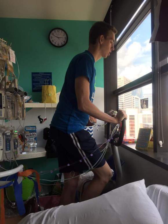 On the stair stepper just now while getting platelets. His doctor laughs & says she can’t believe he feels like doing that.